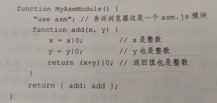 asm.js代码可以跨浏览器,支持asm.js的浏览器就启用激进的JIT优化,甚至是AOT编译,而不能支持的浏览器也可以当作普通的js代码允许